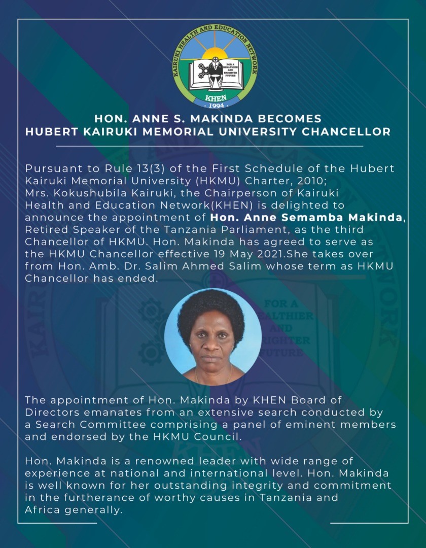 Hon. Anne S. Makinda Becomes Hubert Kairuki Memorial University Chancellor